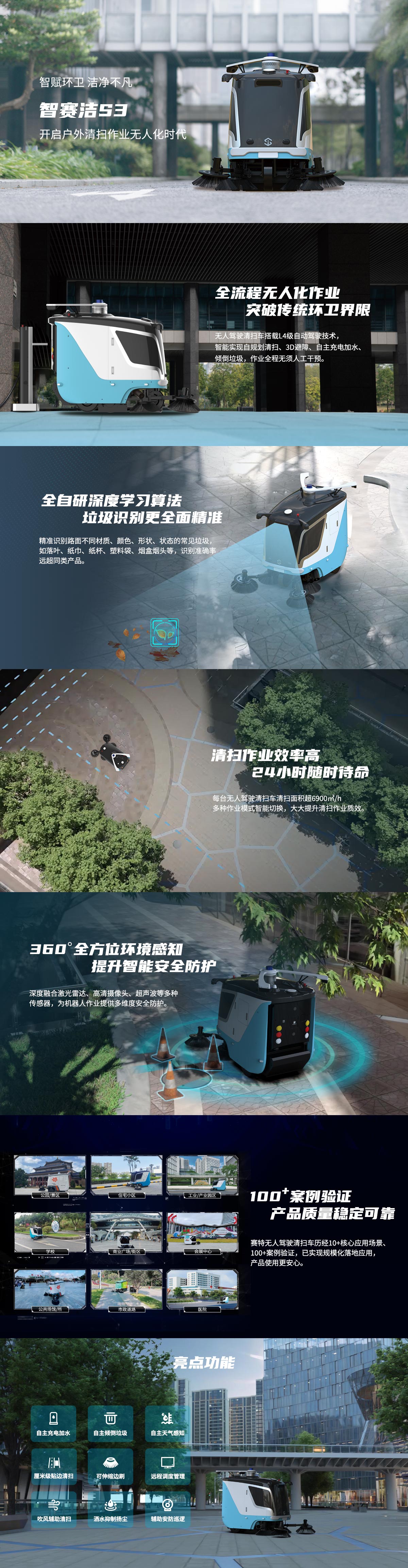 智賽潔S3無人駕駛清掃車是一款具有劃時代意義的室外無人駕駛清掃高科技產品,其融合了當今時代前沿的人工智能科技與先進的智慧環衛管理理念,實現了無人化的室外智能清掃作業,助力實現環衛服務精細化、智慧化管理。